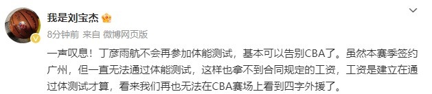 原文寫道:“一聲嘆息!丁彥雨航不會再參加體能測試,基本可以告別CBA了。雖然本賽季簽約廣州,但一直無法通過體能測試,這樣也拿不到合同規(guī)定的工資,工資是建立在通過體測試才算,看來我們再也無法在CBA賽場上看到四字外援了。 ???”
