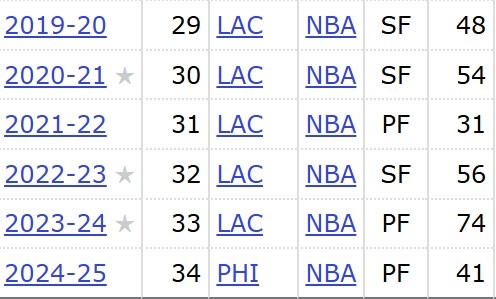 據(jù)統(tǒng)計,本賽季喬治出戰(zhàn)41場,是他自2021-22賽季以來出戰(zhàn)最少的一個賽季,近6年,他已經(jīng)5次出戰(zhàn)不足60場,具體如下: