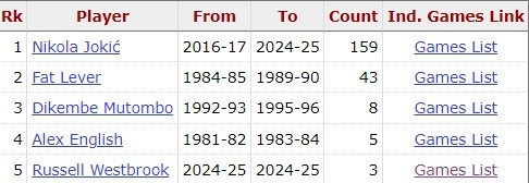 本場(chǎng)是威少加盟掘金以來(lái)第4場(chǎng)三雙,這已經(jīng)能排到掘金隊(duì)史三雙榜前5。
