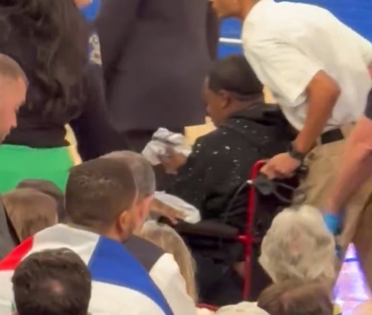 這位觀眾名叫崔西-摩根,是美國(guó)一位喜劇演員,也是尼克斯的死忠粉。他在場(chǎng)邊觀戰(zhàn)時(shí)突然流鼻血,幾乎站不起來(lái),最后被輪椅推出場(chǎng)外。