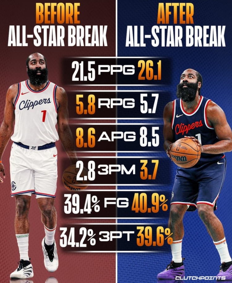 - 哈登全明星后場均26.1分5.7板8.5助 得分命中率皆有明顯上漲