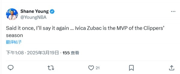 對此,美記Shane Young發(fā)推寫道:“再說一次,我還會繼續(xù)說——祖巴茨就是快船本賽季的MVP!”