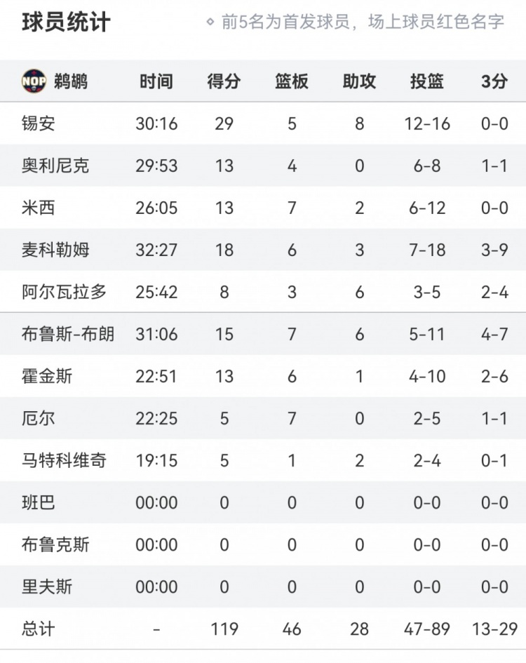 本場比賽,鵜鶘全隊多點開花,共6人得分上雙。具體如下: