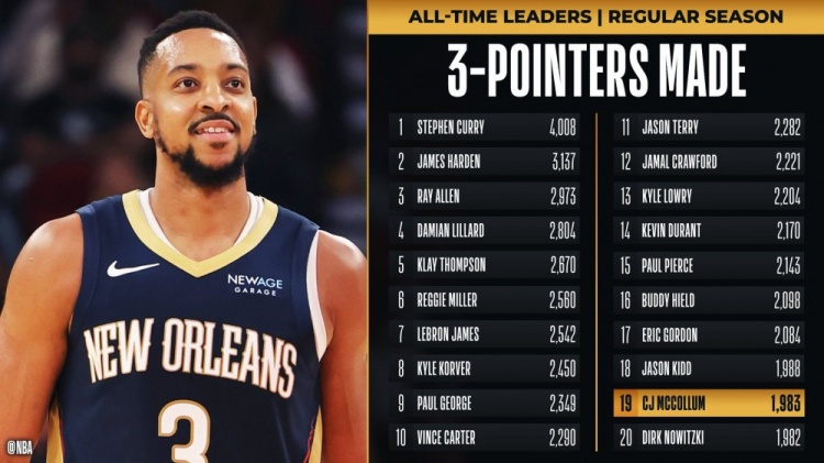 - 生涯能到多少?CJ三分命中數(shù)1983 超越諾維茨基升至歷史第19