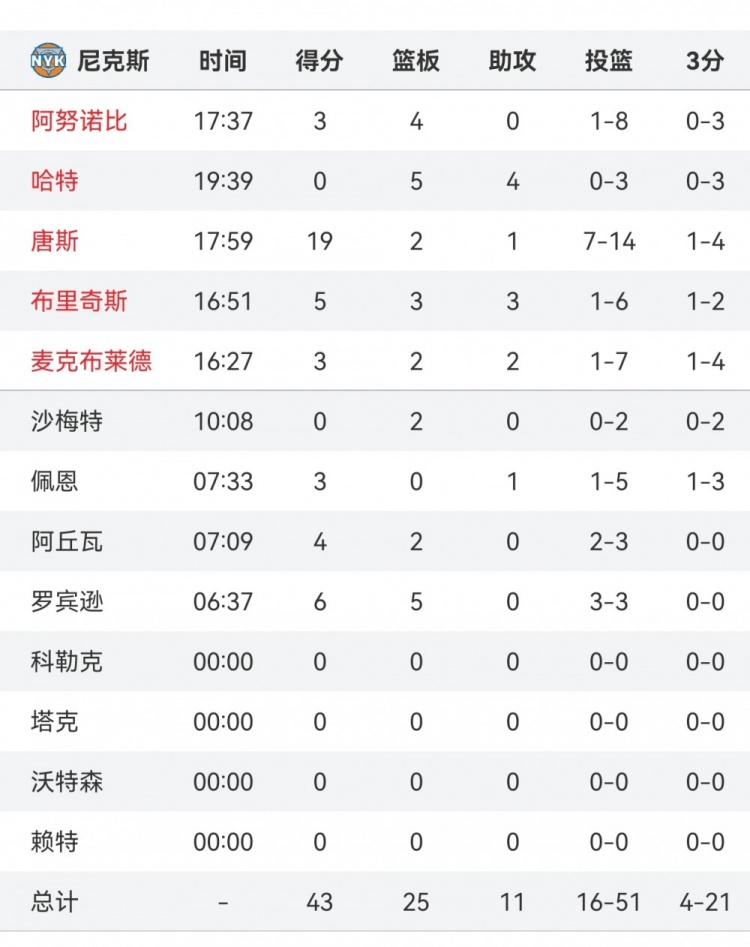 半場比賽,尼克斯首發(fā)除了唐斯以外都表現(xiàn)不佳,投籃共計24中3,共得到11分。