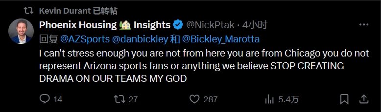 球迷一:我簡直不能更強(qiáng)調(diào)這一點(diǎn),你不是本地人,你是芝加哥人,不能代表亞利桑那州的體育迷,也不能代表我們的任何想法。停止在我們的球隊(duì)制造鬧劇吧,老天??!