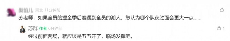 網(wǎng)友在蘇群公眾號評論區(qū)評論道:“蘇老師,如果全員的掘金季后賽遇到全員的湖人,您認為哪個隊獲勝面會更大一點……”