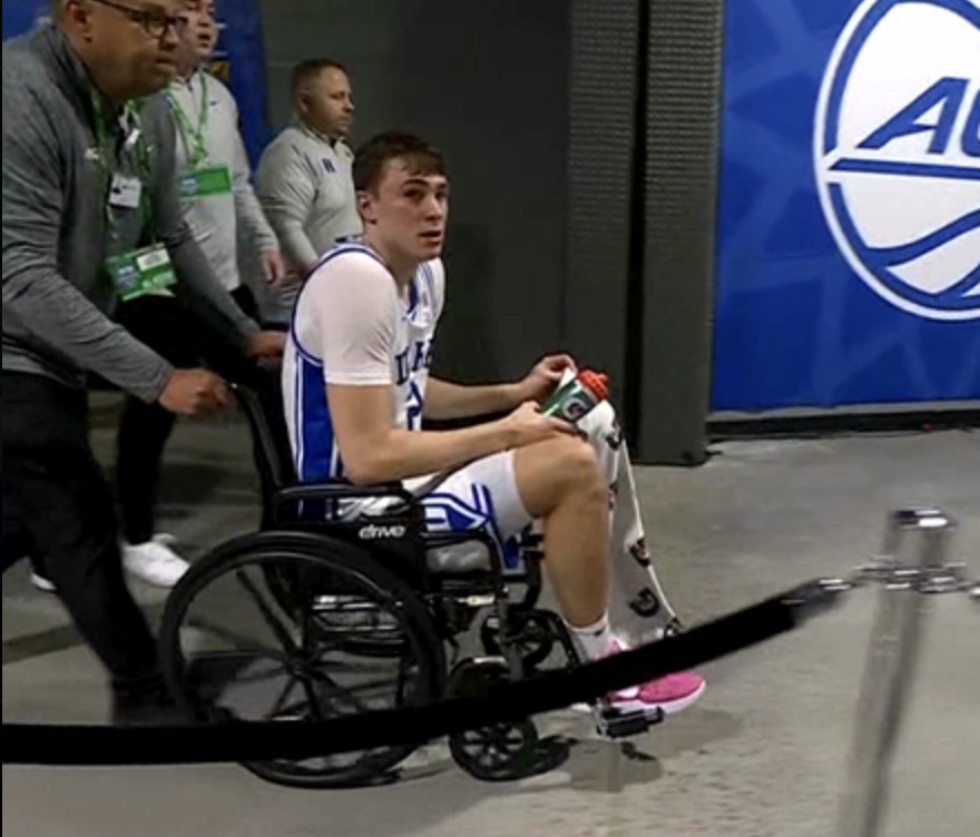 3月14日,ACC分區(qū)錦標(biāo)賽1/4決賽,杜克大學(xué)對陣佐治亞理工學(xué)院上半場,弗拉格在搶籃板落地時(shí)踩到對手恩東戈的腳上扭傷腳踝,他起身后被攙扶著走到場邊,之后坐著輪椅離場,在接受檢查之后自行走回球隊(duì)替補(bǔ)席,下半場沒有出戰(zhàn)。