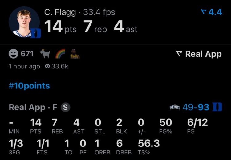 - 弗拉格瘋?cè)仔?2中6輕取14分7板4助2帽 幫助杜克大勝圣瑪麗山!