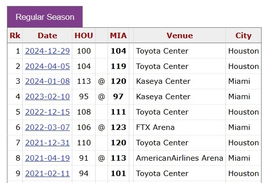 這樣一來,火箭結(jié)束了自己對(duì)熱火的常規(guī)賽9連敗,具體如下: