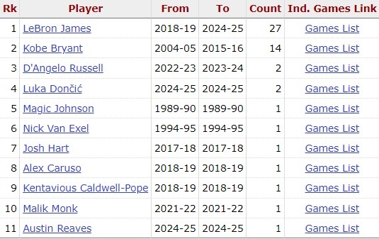 - 湖人隊(duì)史30+5+5+5三分場次:詹姆斯27 科比14 東契奇&拉塞爾2