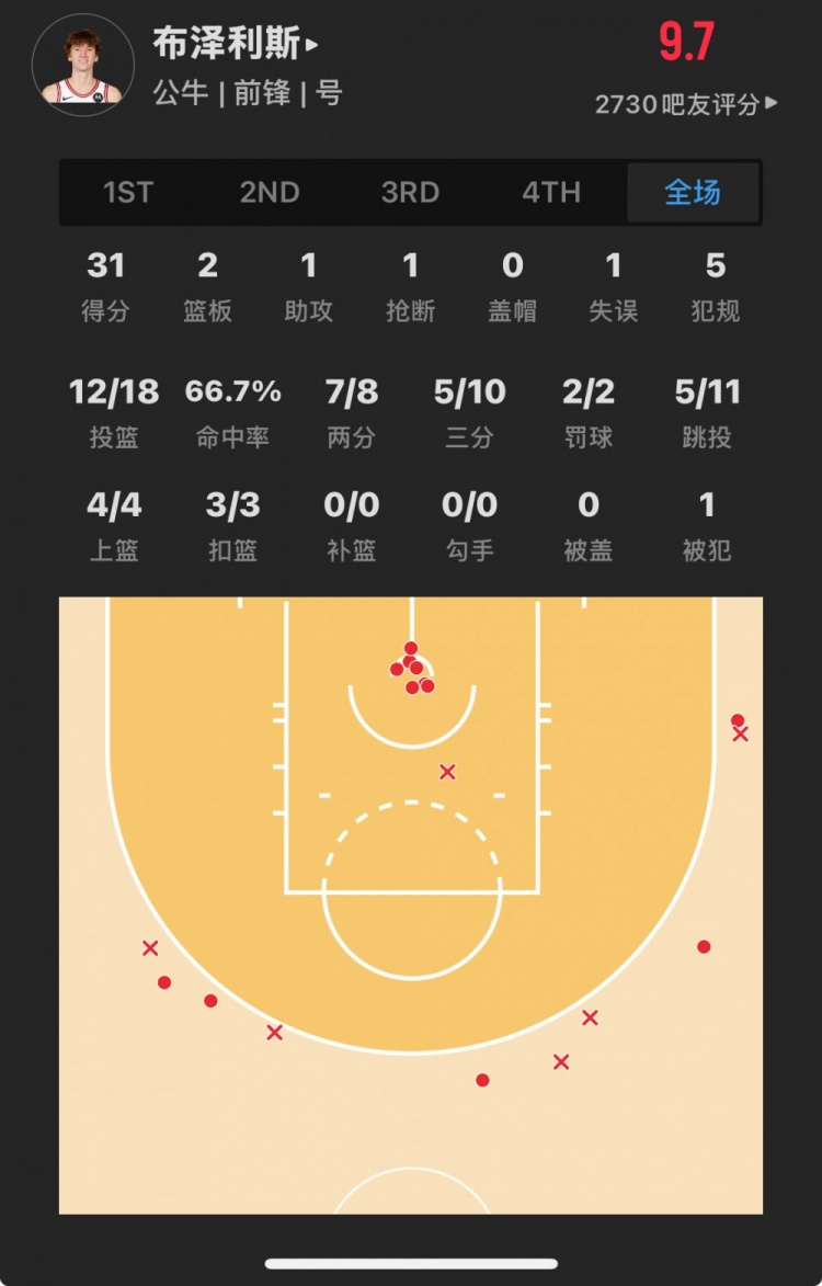 公牛11號(hào)秀 馬蒂斯-布澤利斯 登場(chǎng)29.9分鐘