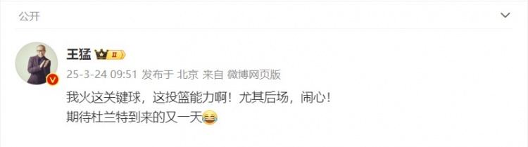 王猛在個(gè)人微博上寫道:“我火這關(guān)鍵球,這投籃能力??!尤其后場(chǎng),鬧心!