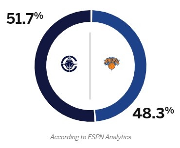 ESPN給出了本場比賽勝率預(yù)測,其中快船51.7%,尼克斯48.3%。
