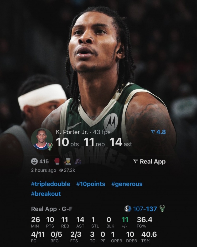這是小凱文-波特加盟雄鹿后出戰(zhàn)的第10場比賽,他也成為隊(duì)史首位在加盟后前10場比賽中便拿下三雙的球員。