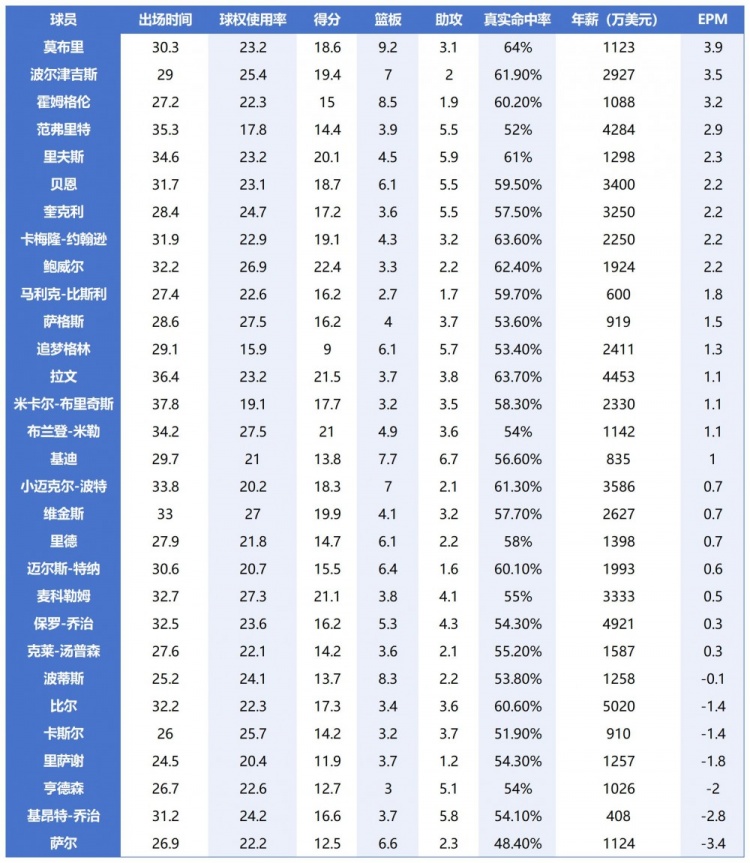 論綜合影響力,具備超強(qiáng)防守影響力的高大內(nèi)線優(yōu)勢巨大。30位三當(dāng)家EPM排行榜,莫布里、波爾津吉斯和霍姆格倫分列1-3位,他們所效力的球隊(duì)均是本賽季勝率前3位的強(qiáng)隊(duì)??紤]到他們3人攻防兼?zhèn)洌@個(gè)結(jié)果不讓人意外。