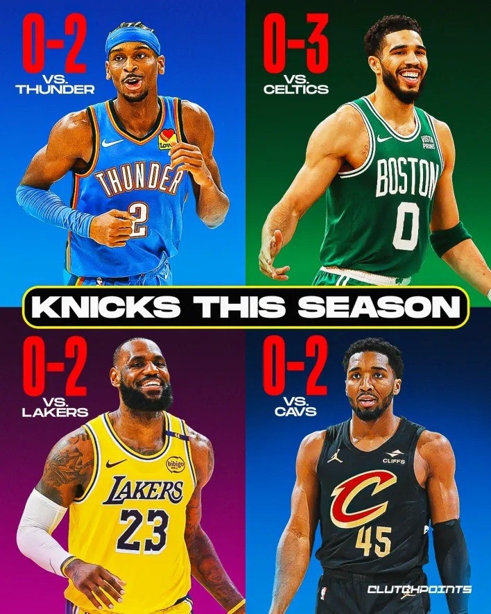 - 欺軟怕硬?尼克斯本季對(duì)聯(lián)盟前四騎士/雷霆/綠軍/湖人共0勝9負(fù)