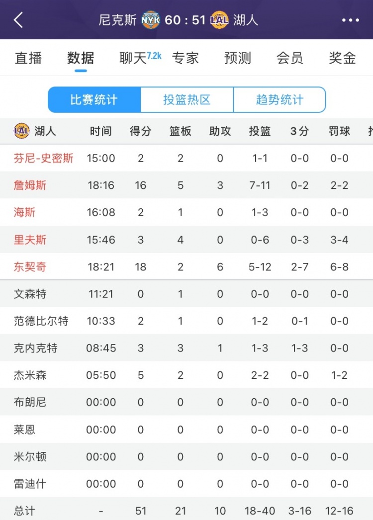 上半場比賽,湖人外線投射不在線,射手也不準(zhǔn),全隊16投僅3中,命中率僅18.8%:東契奇7中2,克內(nèi)克特3中1,詹姆斯2中0,里夫斯3中0,范德比爾特1中0。