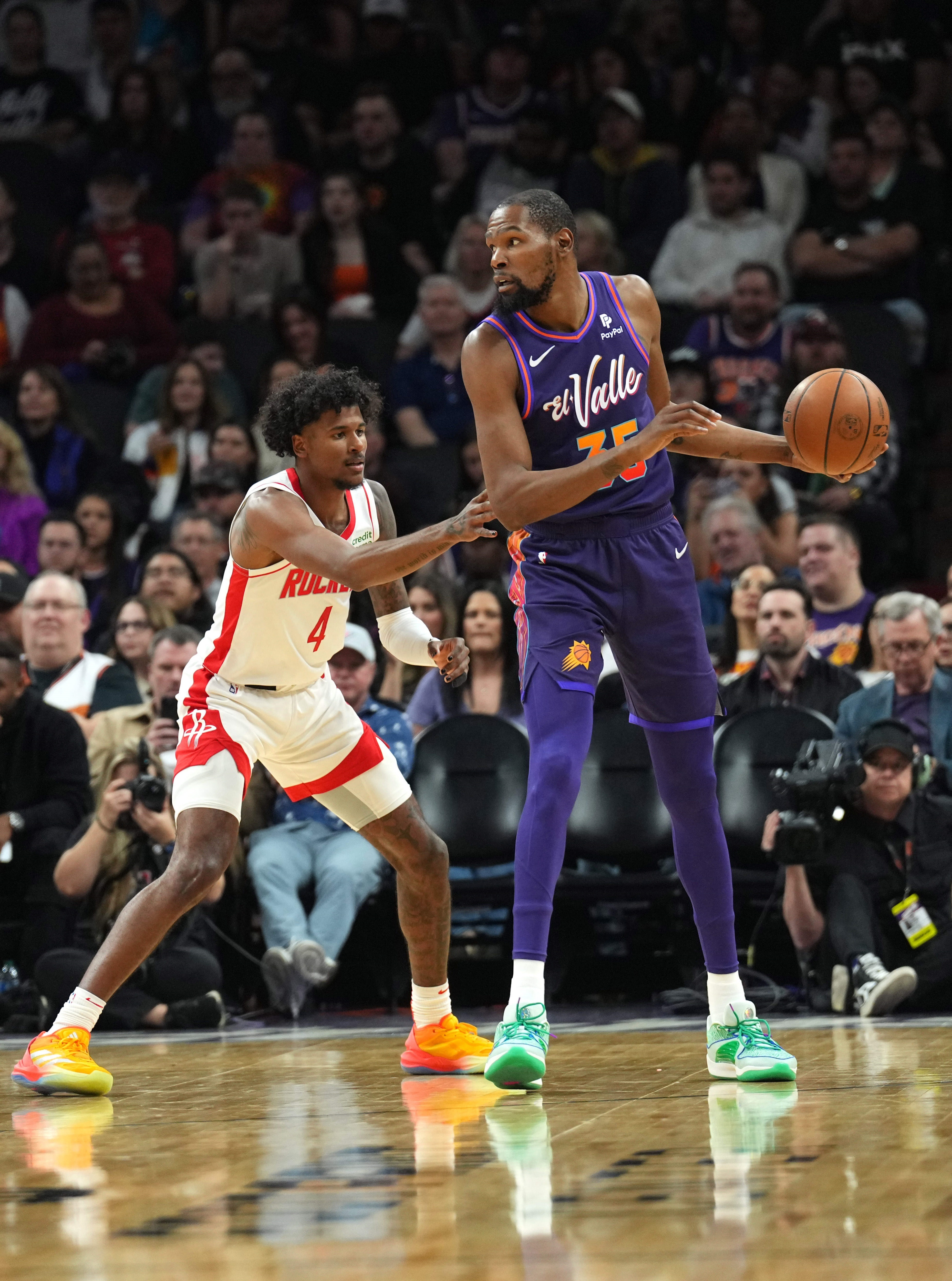 火箭是太陽完美的交易伙伴,主要有兩個(gè)原因。首先,杜蘭特完美填補(bǔ)了火箭最大的短板。憑借年輕的核心陣容和強(qiáng)悍的防守,火箭正在西部崛起。但他們?nèi)狈σ晃荒軌驇ьI(lǐng)球隊(duì)爭冠的頂級(jí)得分手,根據(jù)Cleaning the Glass網(wǎng)站的數(shù)據(jù),本賽季火箭的半場進(jìn)攻效率僅排名聯(lián)盟第25位。即使已經(jīng)36歲,杜蘭特也能在這一領(lǐng)域帶來顯著提升,他的使用率和真實(shí)命中率都遠(yuǎn)高于火箭輪換陣容中的任何一名球員。其次,火箭控制著太陽2025年、2027年和2029年的首輪簽,這些首輪簽最初是太陽在交易杜蘭特時(shí)送給籃網(wǎng)的。重新獲得部分或全部首輪簽將使太陽能為杜蘭特時(shí)代畫上圓滿句號(hào),同時(shí)也讓球隊(duì)能夠在未來自由操作,而不必?fù)?dān)心失去樂透簽的風(fēng)險(xiǎn)。