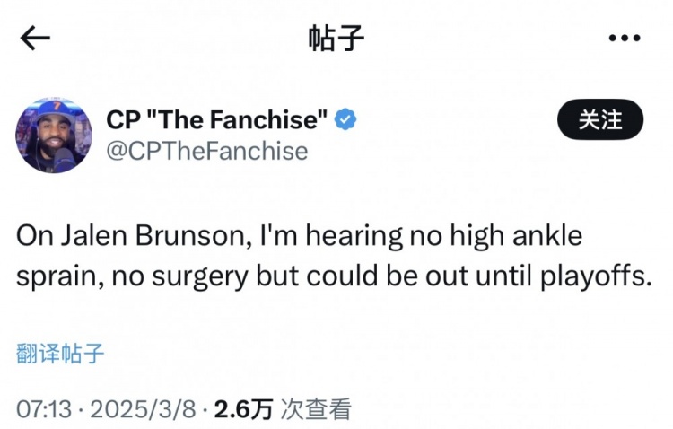 3月8日訊 今日,尼克斯自媒體博主CP“The Franchise”發(fā)推報(bào)道了尼克斯后衛(wèi)布倫森的傷情。