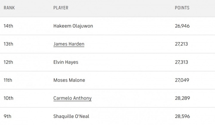 庫(kù)里是否有機(jī)會(huì)再超越其他人?或者達(dá)到30000分里程碑?以下是目前得分榜第8到第5位的情況: