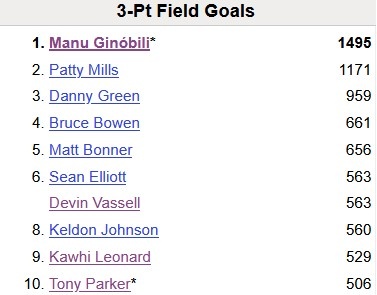 在他身前的是“紅曼巴”邦納(656),而高居榜首的是“妖刀”吉諾比利,他投進(jìn)了1495個(gè)三分。