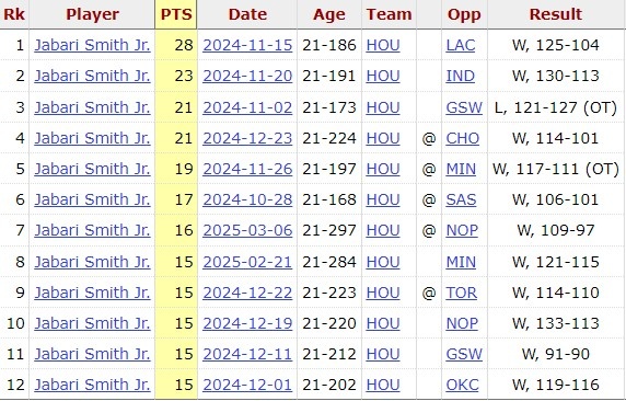 - 賈巴里-史密斯本賽季得分15+的比賽火箭12勝1負 只輸給勇士