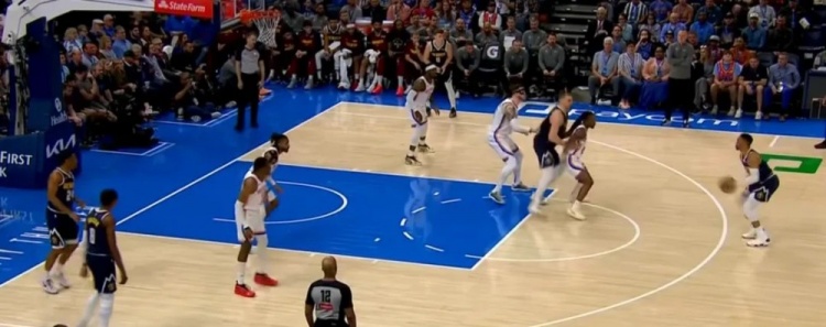 但是,由于威少(也可以是布勞恩)強勢的身體和出球能力,會讓他在類似的回合里,給對位的防守人不小的壓力。而對手想在約基奇、波特、穆雷都在三分線上的時候支援中路,恐怕也不那么容易。如果你有單防弱點要藏,掘金可以用這種方式去無球針對。