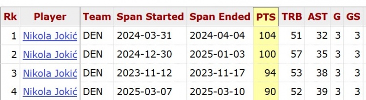 據統(tǒng)計,約基奇在連續(xù)3場比賽中至少得到90分50籃板30助攻,自聯(lián)盟合并以來唯一,而且他生涯已經是第4次做到這一點。