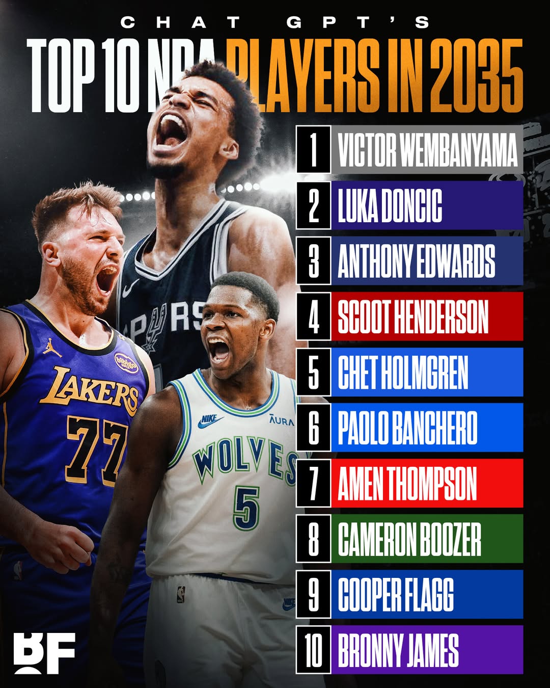 - ChatGpt預(yù)測十年后前十球員:文班第一 東契奇第二 布朗尼第10