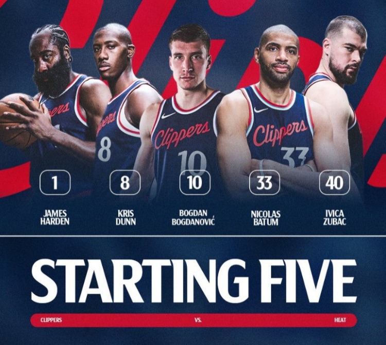 - 小卡輪休!快船首發(fā):哈登、鄧恩、博格丹、巴圖姆、祖巴茨