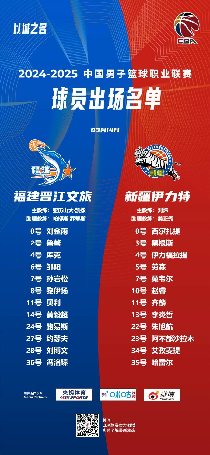 福建隊:劉金雨、魯驁、庫克、鄒陽、孫巖松、黎伊揚(yáng)、貝利-斯蒂爾、黃毅超、路易斯、約瑟夫-楊、劉博文、馮洺臻