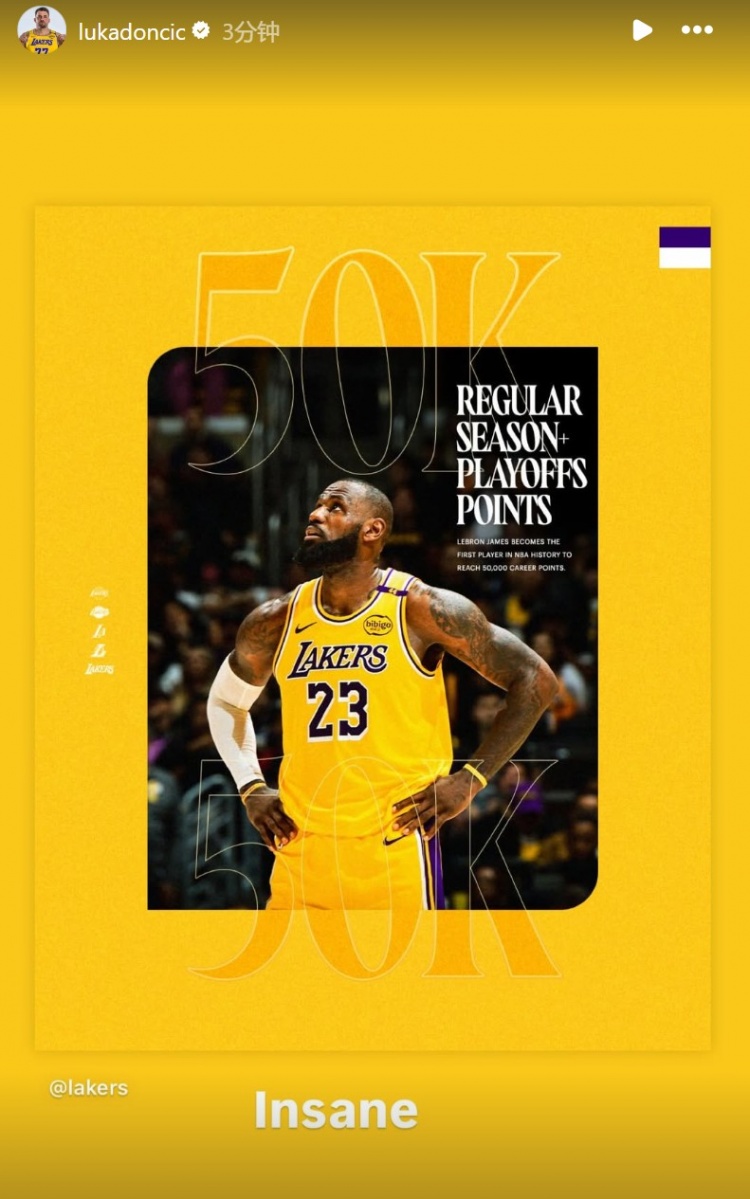 在本場比賽中,詹姆斯生涯總得分突破50000分;賽后,東契奇轉發(fā)了海報并評論道:“太瘋狂了?!?/p>
