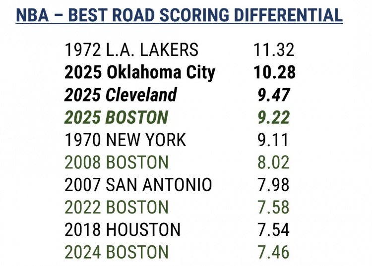 - 歷史單賽季客戰(zhàn)場(chǎng)均凈勝分榜:72年湖人第一 今年雷騎綠有望沖擊