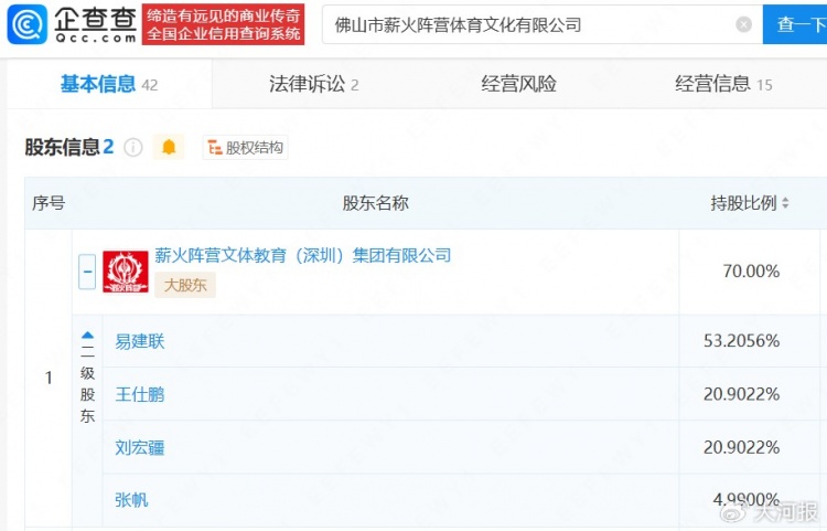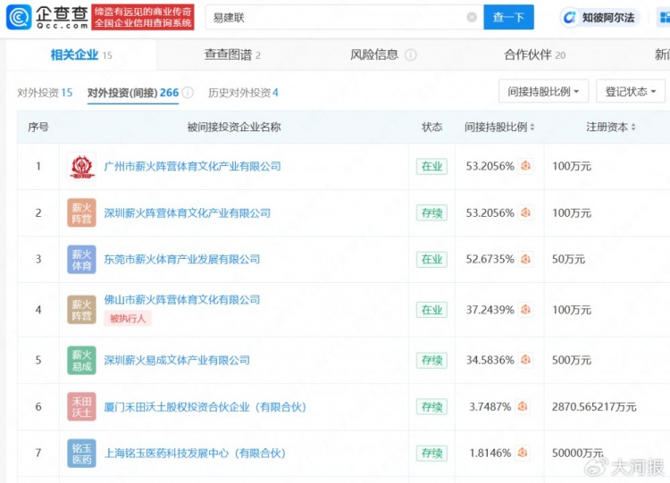 企查查APP顯示,易建聯(lián)關(guān)聯(lián)15家企業(yè),其中12家為存續(xù)狀態(tài),包括薪火陣營(yíng)文體教育(深圳)集團(tuán)有限公司、上海壹球成名信息技術(shù)有限公司等。此外,易建聯(lián)間接持股企業(yè)超200家,行業(yè)涉及除體育文化外,還包括商貿(mào)、科技、投資等領(lǐng)域。今年2月,易建聯(lián)關(guān)聯(lián)企業(yè)佛山市薪火陣營(yíng)體育文化有限公司成被執(zhí)行人,執(zhí)行標(biāo)的約12萬(wàn)元。
