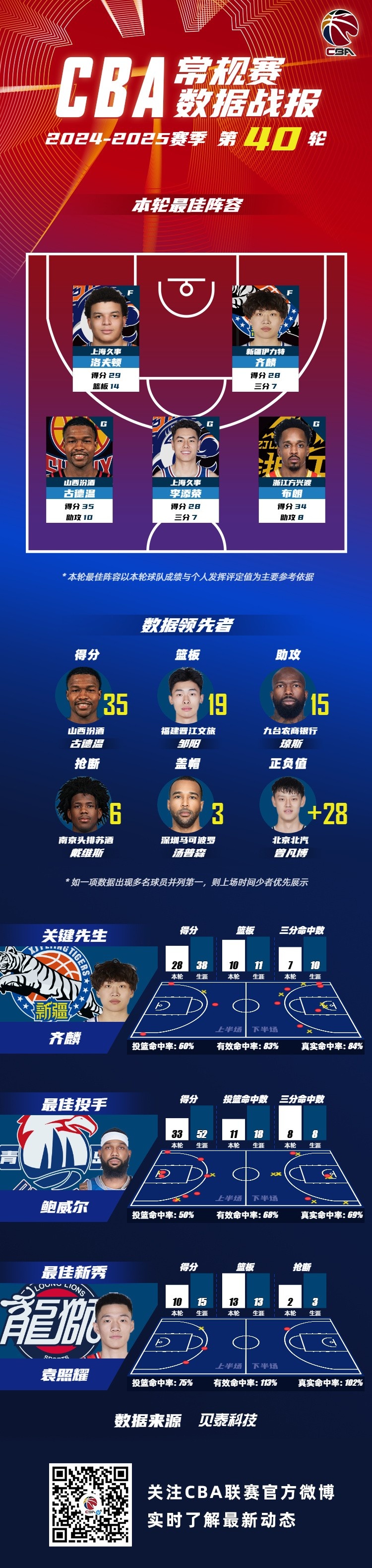 2024-2025賽季CBA聯(lián)賽常規(guī)賽第40輪結(jié)束較量,來(lái)自上海久事大鯊魚的洛夫頓和李添榮,新疆廣匯籃球俱樂部的齊麟,山西汾酒職業(yè)籃球俱樂部的古德溫和浙江廣廈籃球俱樂部的布朗入選CBA聯(lián)賽常規(guī)賽第40輪最佳陣容!