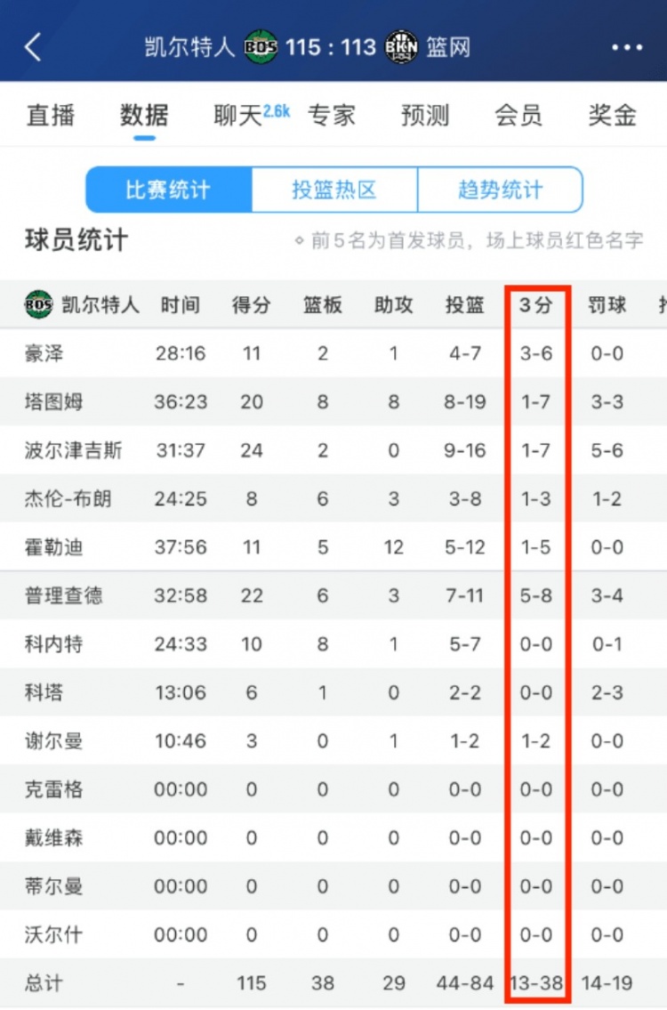 本場(chǎng)比賽,凱爾特人全隊(duì)三分整體來說有些失準(zhǔn),38投13中,命中率僅34.2%;除了普理查德(8中5)和豪澤(6中3)正常發(fā)揮外,其余人皆失常,僅24中5。