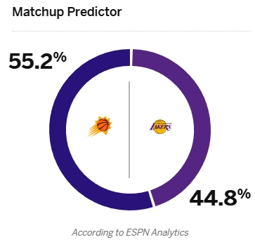 ESPN賽前預(yù)測兩隊(duì)本場勝率:太陽55.2%、湖人44.8%。