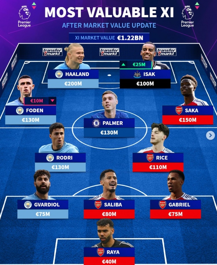 - 德轉(zhuǎn)列英超最貴陣:阿森納5人、曼城4將,帕爾默、伊薩克在列