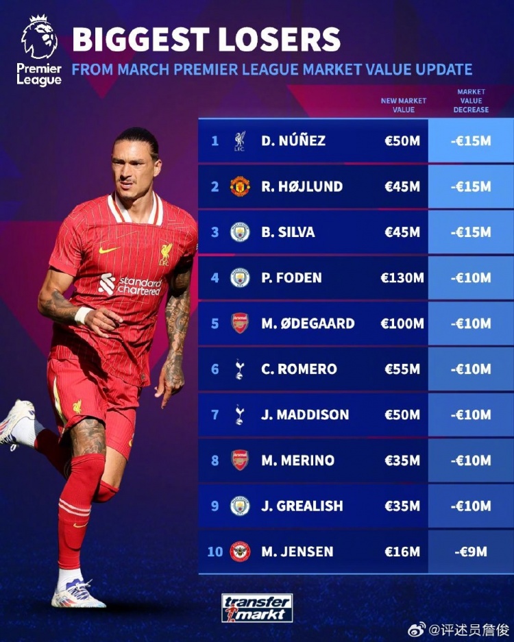 3月19日訊 昨日,德轉市場更新了英超聯(lián)賽球員最新身價。