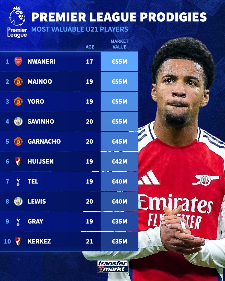 - 英超U21德轉(zhuǎn)身價:恩瓦內(nèi)里、梅努、約羅、薩維尼奧5500萬歐最高
