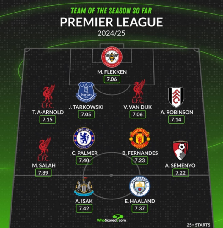 3月19日訊 數(shù)據(jù)網(wǎng)站W(wǎng)hoscored盤點了本賽季英超至今場均評分最高的11人陣容(至少25次首發(fā)),其中薩拉赫、哈蘭德、B費等人在列,具體陣容如下: