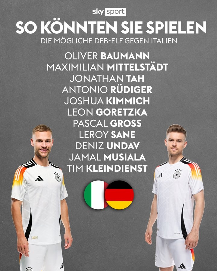 德天空預(yù)測德國隊首發(fā)如下:鮑曼、米特爾施塔特、若納坦-塔、呂迪格、基米希、格雷茨卡、格羅斯、薩內(nèi)、翁達(dá)夫、穆西亞拉、克萊因丁斯特
