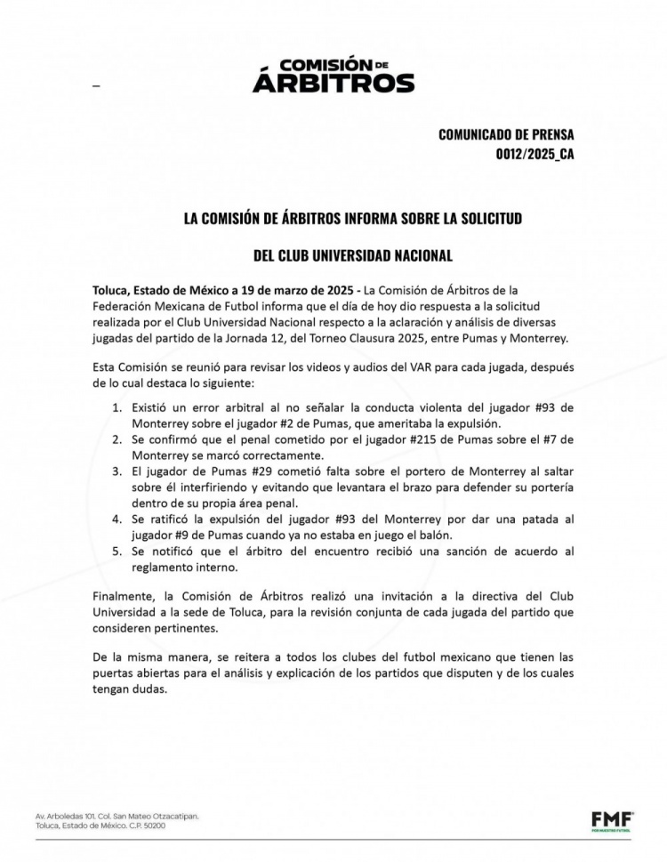 墨西哥美洲獅俱樂部賽后提出申請,希望墨西哥裁判委員會對比賽中的判罰做出澄清和分析,裁判委員會發(fā)布公告,確認當值主裁存在失誤,拉莫斯上半場肘擊對手就應該被罰下,但裁判沒有對其出示紅牌。
