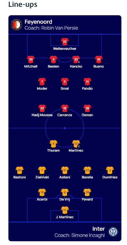 3月6日訊 歐冠1/8決賽首回合,國米客場對陣費耶諾德。賽前,官方公布了本場的首發(fā)名單。