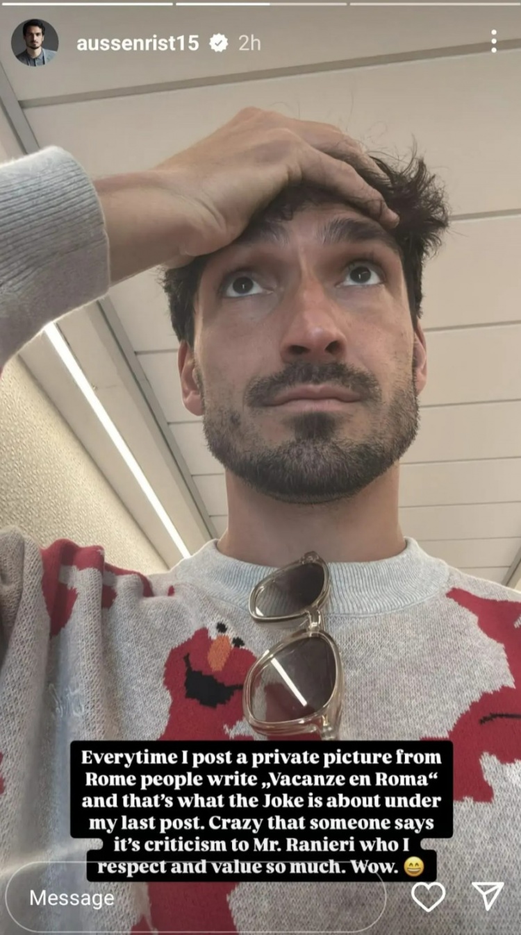 隨后,胡梅爾斯更新社媒進(jìn)行澄清。他曬出自己表情無奈的自拍,并寫道:每當(dāng)我發(fā)布在羅馬的私人照片時(shí),人們都會(huì)寫‘羅馬假日’,這就是我上一篇帖子下面鬧出的笑話。 有人說那是對(duì)拉涅利先生的批評(píng),這太瘋狂了,我非常敬重他。哇。????