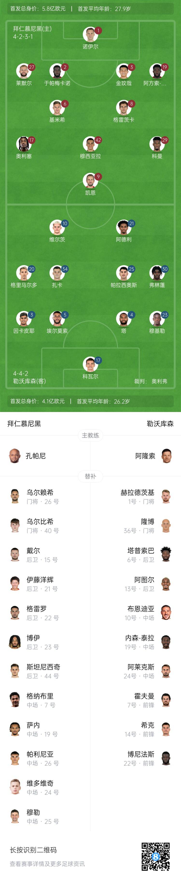 拜仁首發(fā):1-諾伊爾、27-萊默爾、2-于帕梅卡諾、3-金玟哉、19-阿方索-戴維斯、6-基米希、8-格雷茨卡、42-穆西亞拉、11-科曼、17-奧利塞、9-凱恩