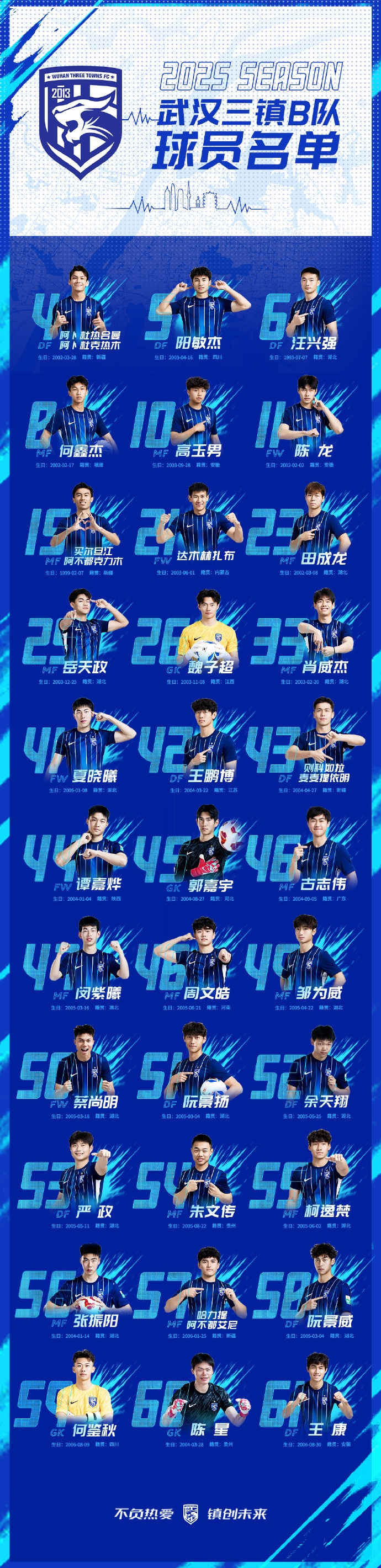 新賽季中乙聯(lián)賽開戰(zhàn)在即,身披上賽季U21聯(lián)賽冠軍的榮光,武漢三鎮(zhèn)B隊即將踏上嶄新的戰(zhàn)場。讓我們跟隨名單去認識各位隊員,感受來自三鎮(zhèn)的青春力量!