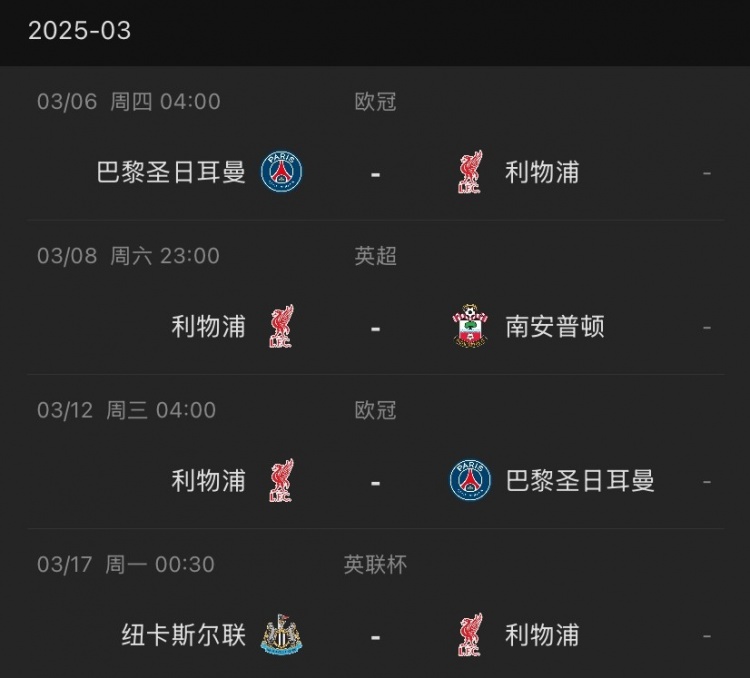 利物浦本月賽程↓