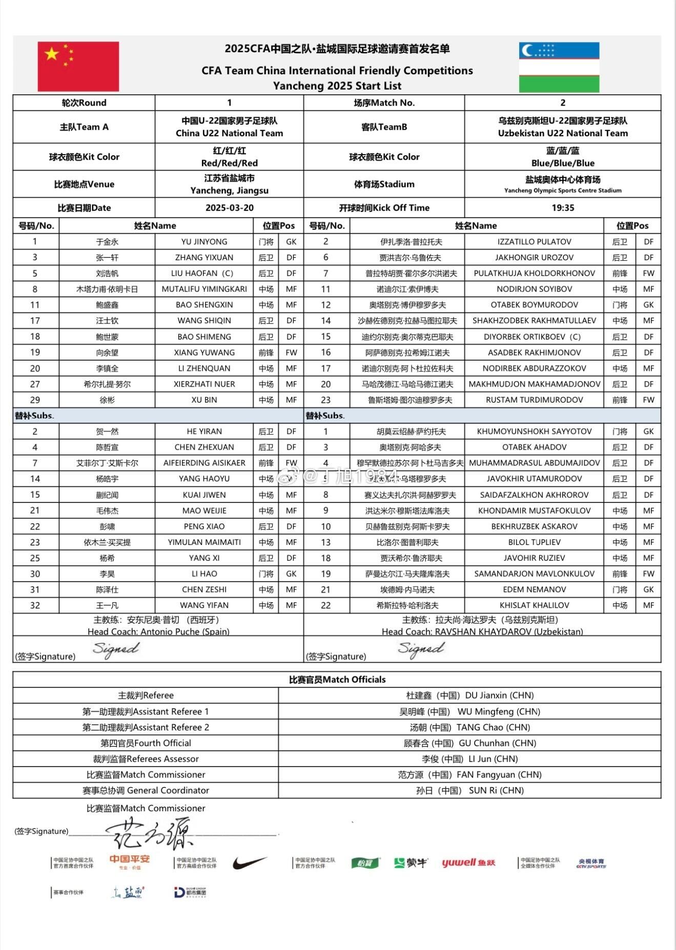 03月20日訊 2025CFA中國之隊·鹽城國際足球邀請賽,中國男足U22vs烏茲別克斯坦U22,賽前雙方首發(fā)公布!此前從國家隊集訓回歸的徐彬、汪士欽、劉浩帆先發(fā)出戰(zhàn)。